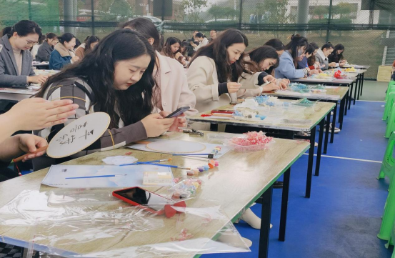 在一首首柔和的音乐中,女教职工们开始进行个人团扇制作,参加集体击掌传扇、抽幸运数字等互动游戏,现场欢声笑语,气氛和谐。