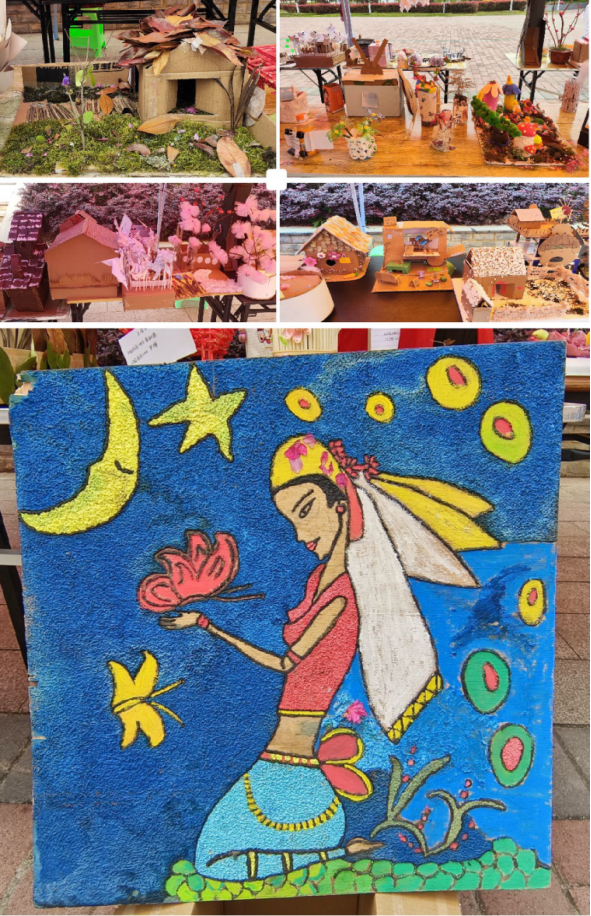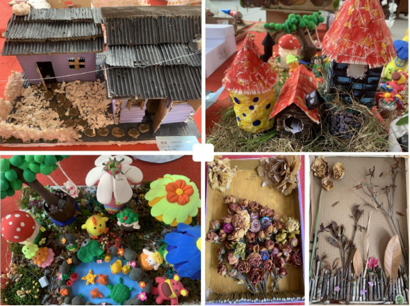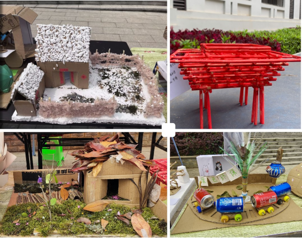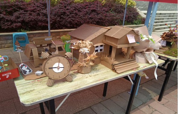 展览作品以“废物利用加创新,动手实践创佳品”为主题。同学们以硬纸板、塑料品、树枝、果壳和棉线等材料为素材,经过裁剪、描绘、重组,赋予废品新的生命,变成创意独特、形状新颖的作品。