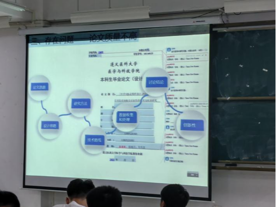 在讲座中,欧刚卫副院长解读了《深化新时代教育评价改革总体方案》《关于深化新时代教育督导体制机制改革的意见》和《贵州省本科毕业论文(设计)抽检实施细则(试行)》文件精神。随后,他围绕论文的选题意义、逻辑构建、专业能力和学术规范作详细阐述,并以毕业论文《探讨易瑞沙治疗非小细胞肺癌(骨转移)和无骨转移在临床上的差异性》为例,讲解了专家评价意见中出现的问题及解决方法。