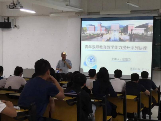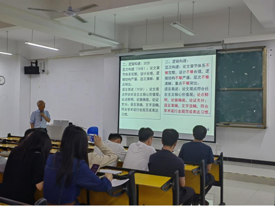 2023年5月25日19:00,我院在二号教学楼第一阶梯教室举办青年教师论文指导能力提升讲座,学院副院长欧刚卫主讲,40余名本科毕业生论文指导教师参加。