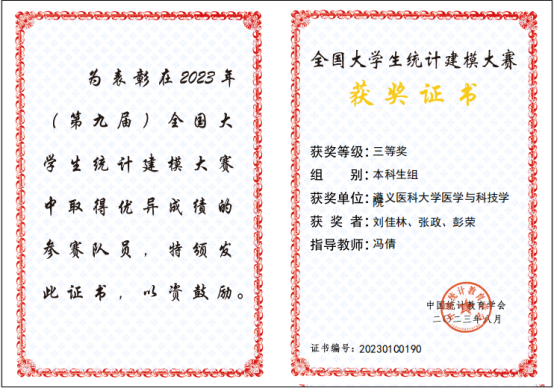 2023年8月30日,由国家统计局统计教育培训中心指导,中国统计教育学会联合教育部高等学校统计学类专业教学指导委员会、全国应用统计专业学位研究生教育指导委员会举办的2023年(第九届)全国大学生统计建模大赛全国赛公布获奖名单。智能信息工程学院学子首次参赛,荣获国家级三等奖。