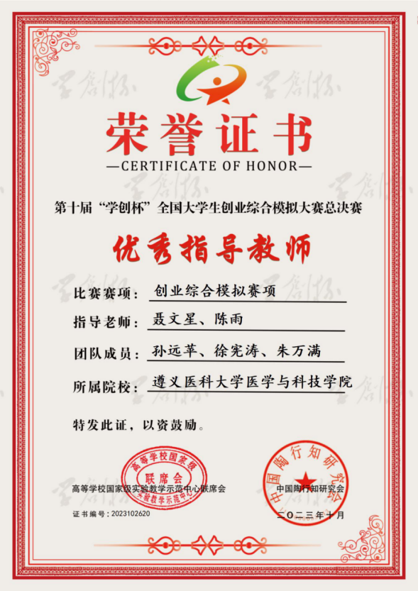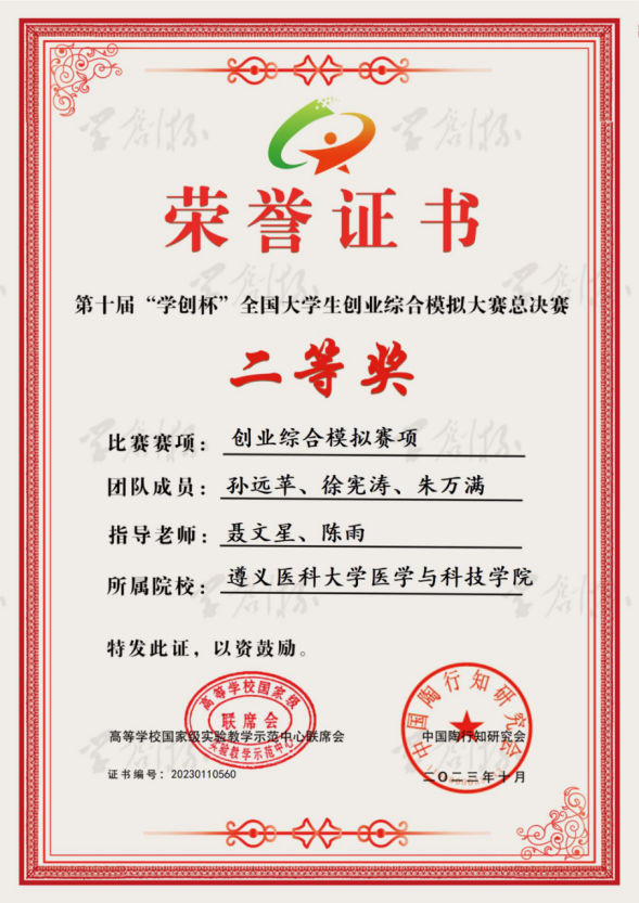 2023年10月,第十届“学创杯”全国大学生创业综合模拟大赛在哈尔滨工程大学举行。我院师生在省赛中荣获省级二等奖,成功晋级全国总决赛,最终斩获全国二等奖,教师聂文星与陈雨获得优秀指导教师。