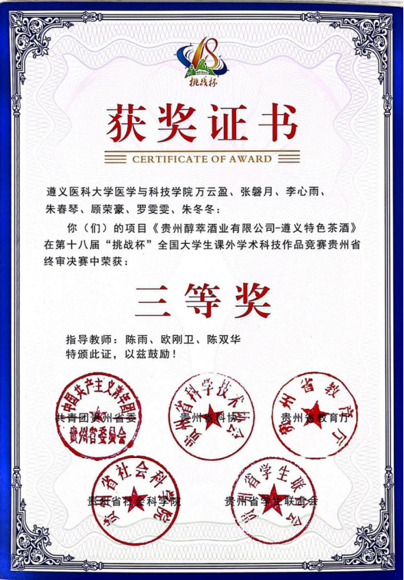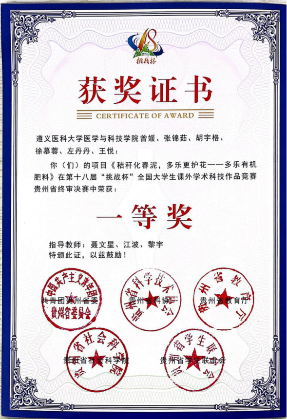 本届“挑战杯”竞赛共设置主体赛、“揭榜挂帅”专项赛、红色专项活动、“黑科技”展示活动四个类别。我院学生曾媛、张锦茹、胡宇格、徐慕蓉、左丹丹、王悦的作品《秸秆化春泥,多乐更护花——多乐有机肥料》在主体赛道获省赛一等奖(指导教师:聂文星、江波、黎宇);万云盈、张磐月、李心雨、朱春琴、顾荣豪、罗雯雯、朱冬冬的作品《贵州醇萃酒业有限公司——遵义特色茶酒》在主体赛道获省赛三等奖(指导教师:陈雨、欧刚卫、陈双华);李桃欢、王春鹏、张颖怡、何昀津、詹云龙、唐瑜璘、胡善钦、谭定钊、冯钺的作品《赓续红军长征精神,践行医路长征使命》在红色专项赛道获省赛二等奖(指导教师:廖小影、欧刚卫、杨发勇);黄炳坤、刘金鑫、向先锋、徐青谧的作品《沉浸式学习红色精神—— 结合新时代 VR 技术探寻