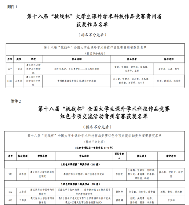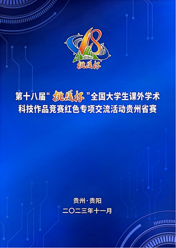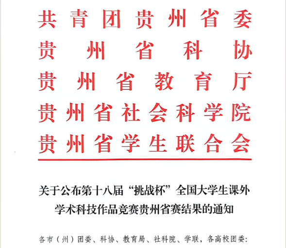 由共青团中央、中国科学技术协会、教育部、中国社会科学院、全国学联、贵州省人民政府共同主办,贵州大学承办的第十八届“挑战杯”全国大学生课外学术科技作品竞赛的各项赛事圆满落幕。我院在主体赛道获省赛一等奖一项,三等奖一项;在红色专项活动中获省赛二等奖一项,三等奖两项。