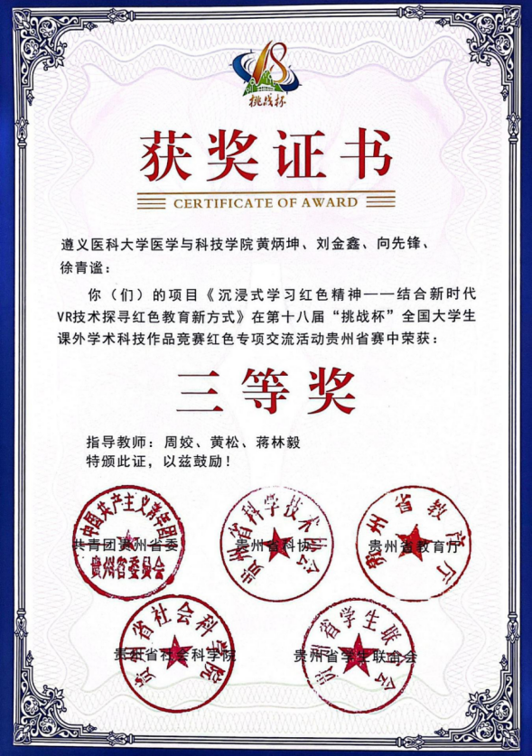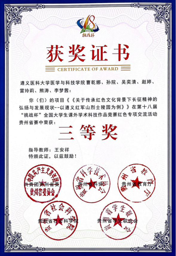 红色教育新方式》(指导教师:周姣、黄松、蒋林毅),曹乾娜、孙院、吴奕清、赵婷、雷玲莉、熊涛、李梦茜的作品《关于传承红色文化背景下长征精神的弘扬与发展现状——以遵义红军山烈士陵园为例》(指导教师:王安祥)两项作品分别获红色专项赛道省赛三等奖。