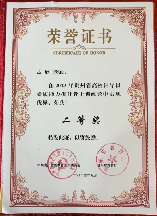 为深入学习贯彻习近平新时代中国特色社会主义思想,贯彻落实党的二十大精神和全国全省高校思想政治工作会、学校思想政治理论课教师座谈会精神,落实《普通高等学校辅导员队伍建设规定》(教育部令第43号)要求,进一步突出群众性、示范性、互动性、差异性、引领性,省教育厅举办了2023年贵州省高校辅导员素质能力提升骨干训练营,我院智能信息工程学院辅导员孟欣老师参加了此次训练营与全省81名辅导员老师同台竞技,并荣获二等奖。