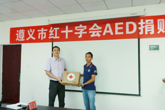 遵义市红十字会副会长(兼)张明方代表遵义市红十字会向我院捐赠AED除颤仪,用于学院相关课程教学,学院副院长高德健接受并致以真挚的感谢。