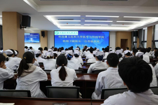 六盘水市人民医院副院长罗语思、科研教学科科长顾红、相关科室和我院临床教学班全体同学、全体实习生参加了本次调研座谈会。会议由六盘水市人民医院副院长罗语思主持。双方就临床教学班同学和实习同学的教学与管理工作展开深入的交流。