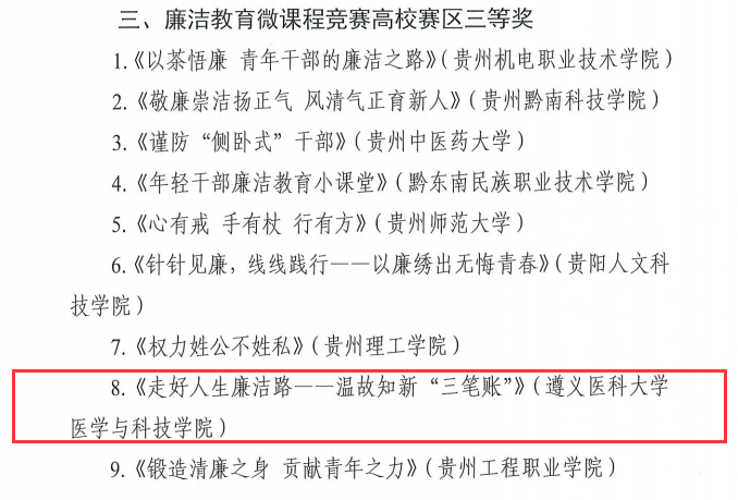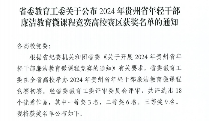 我院公共管理学院教师樊小阔在2024年贵州省年轻干部廉洁教育微课程竞赛中荣获三等奖。