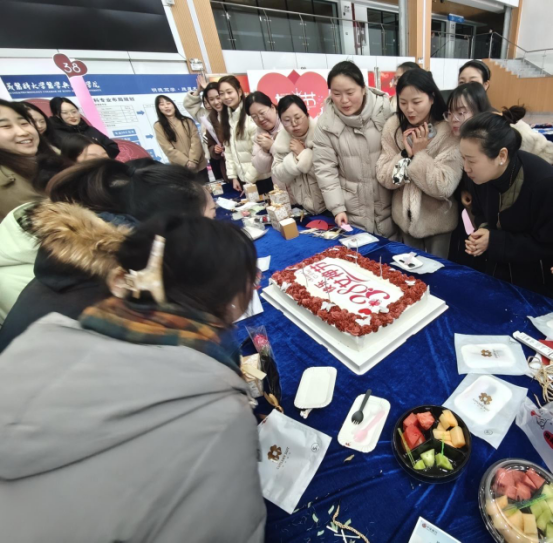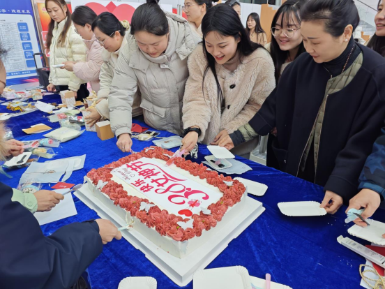 在切蛋糕、吹蜡烛环节。精心布置的活动现场摆放着一个精美的大蛋糕,蛋糕上跳跃的烛光象征着女职工们在工作中燃烧的激情与活力。在欢快温馨的氛围中,学院党委书记、常务副院长周万津与女教师们一同切下第一块蛋糕,随后大家共同吹灭蜡烛,许下美好心愿。现场欢声笑语不断,女职工们的脸上洋溢着幸福的笑容。