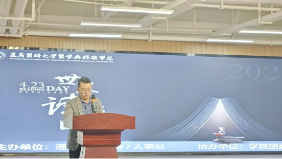 工会主席谭飞致辞。他指出,读书有助于提升教育教学水平,增强学院文化认同感和归属感,并向全体师生发出了积极参与读书活动的倡议。