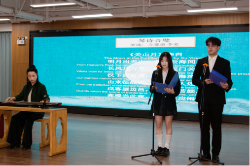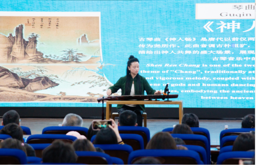 讲座中,付敏老师和熊邱怡兰老师倾情演奏了《神人畅》《幽兰》《流水》《半山听雨》《良宵引》《关山月》《四月八》等著名古琴乐曲。琴声悠扬婉转,余音绕梁,让在场师生仿佛身临其境。当演奏古琴曲《关山月》时,2024级播音专业学生左锦康和2023级英语专业学生李麦在付敏老师的琴声中,以双语朗诵唐代诗人李白的《关山月》,“琴诗合璧”的场景给现场观众留下了深刻印象。