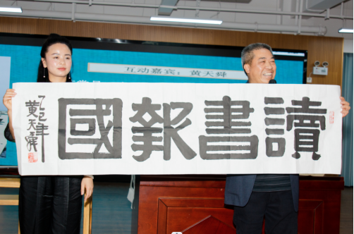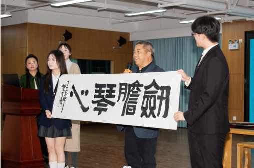 著名书法家黄天舜老师在付敏老师的悠扬琴声中挥毫泼墨,书写了“剑胆琴心”与“读书报国”两幅大字赠予现场观众。他勉励同学们在生活上要有胆识和情致,认真读书,报效祖国。