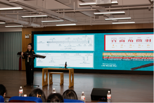 随后,熊邱怡兰老师将中华优秀传统文化与英语教学相结合,以双语探索与赏析的形式,深入浅出地讲述了古琴文化的历史传承,并通过中英文讲解,让学生们通过古琴曲“幽兰”感受到遵义沙滩文化与古琴的紧密关联,了解清代著名外交家黎庶昌与古琴的故事,培养学生对遵义、对中国传统文化的热爱。付敏老师在讲座中引用了《史记·五帝本纪》中尧赐舜“琴”的故事,为同学们详细地介绍了古琴弦数目的历史演变,古琴最初仅有五根弦,分别代表“金、木、水、火、土”五行,也对应“宫、商、角、徵、羽”五个音阶。到了周朝,周文王为悼念伯邑考,增“文弦”一根;武王伐纣时,又增“武弦”一根。直至唐代,古琴才基本固定为七弦。生动形象的讲解,赢得了同学们的热烈反响。