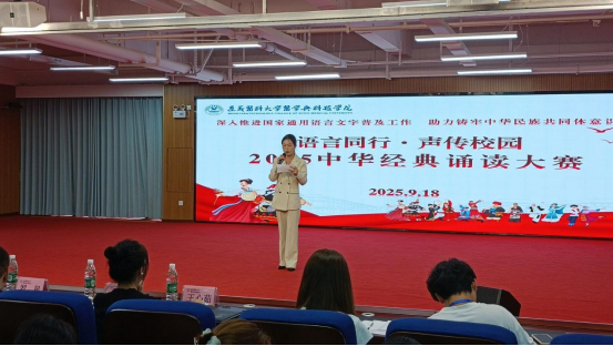 为深入推广国家通用语言文字,传承中华优秀传统文化,铸牢中华民族共同体意识,提升大学生的普通话水平、语言文字应用能力和人文素养,营造“说普通话、写规范字、读经典书、做文明人”的校园氛围,2025年9月18日,校团委在图书馆多功能厅举办“语言同行·声传校园”2025年中华经典诵读大赛。