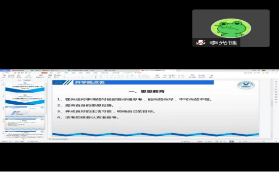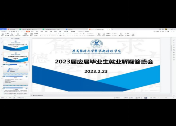 新学期,新起点,力学笃行,有志竟成。为全面增强学生的思想教育,巩固安全防范意识,营造和谐的实习就业氛围,引导学生树立正确的择业观,基础医学院2019级于2023年2月23日下午15:00以视频会议的方式开展了开学第一课暨应届毕业生第二次就业推进会。本次会议由辅导员李萱主持,基础医学院2019级全体同学参加。