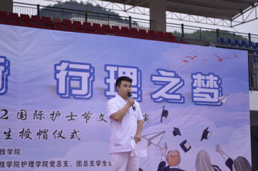 护理学院副院长吴安强致辞,他告诫护理学子要心怀国之大者,铭记南丁格尔精神与誓言,不忘初心,播撒仁爱,努力成长为一名“存仁心、施仁术、献仁爱”的白衣天使。