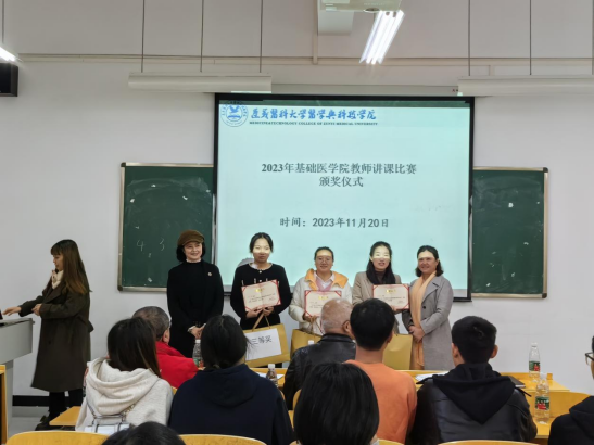 为展现教师风采,促进广大教师提高教学技能,夯实青年教师教学基本功,基础医学院根据学院《关于开展2023年度青年教师讲课竞赛活动的通知》精神,于2023年11月20日在教学楼203A教室组织开展2023年教师讲课比赛初赛,学院副院长欧刚卫、基础医学院副院长谭飞、周播江教授、刘晓丽教授、江波教授担任评委,基础医学院全体教职员工踊跃参与,本次讲课比赛由院系秘书王治姣老师主持。