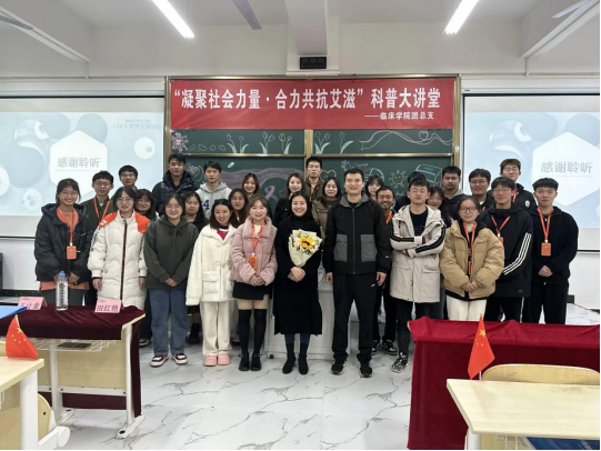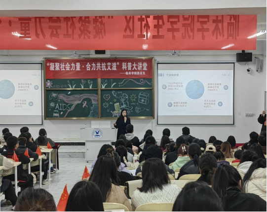 为进一步加强艾滋病宣传,提高学生健康意识,扎实做好预防艾滋病教育工作,临床学院团总支于2023年12月1日在教学楼21阶梯教室举办“凝聚社会力量,合力共抗艾滋”主题讲座,张丽老师作为主讲人,为大家讲解艾滋病防控知识。