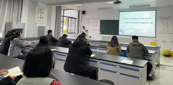 为确保基础医学院实验室安全运行,落实教育部和省教育厅关于高校实验室安全的要求,2023年12月11日,基础医学院于一号实验楼开展实验室安全知识培训活动,此次培训由病原生物学与免疫学教研室的骆礼均老师主讲,基础医学院全体实验室管理人员以及部分专任教师参加。