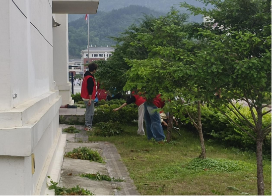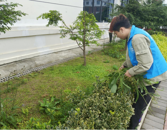 随后,学生按照分组发放小锄头和垃圾袋,在指定区域内进行除草、松土、拾捡垃圾。通过大家的相互协助,实践区域焕发新的面貌。