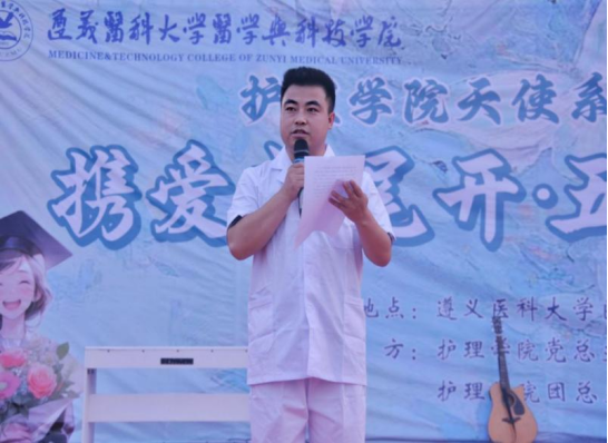 护理学院副院长吴安强致辞,他教导护理学子铭记南丁格尔精神与誓言,不忘初心,传播仁爱。