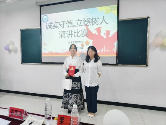临床学院党总支副书记罗浪对参赛选手和工作人员的辛勤付出给予肯定,并鼓励大家在今后的学习、生活中,积极践行诚信承诺,传播诚信文化,共同营造诚实守信、励志自强的浓厚氛围。最后,临床学院辅导员谢浪和石凤洁为获奖选手颁奖,并合影留念。