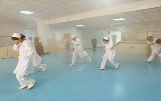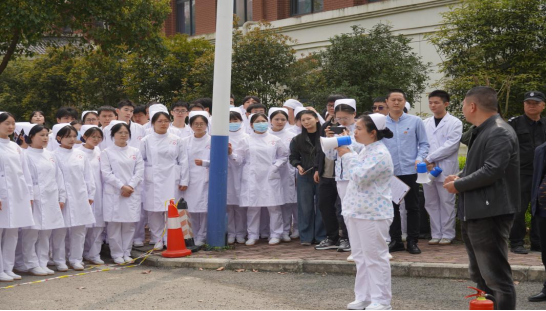 4月10日,护理学实验教学中心联合后勤处以实验室失火为背景,组织正在上课的学生开展火灾应急演练。火灾警报发出后,教师分组引导210名师生于1分15秒内完成撤离,疏散至指定集结点。