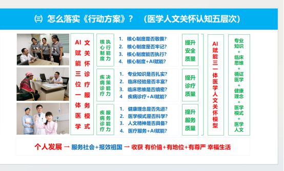 陈院长系统阐释了《医学人文关怀提升行动方案》核心要义,详细论述了医学人文精神的深层含义及其价值所在。结合临床学院医学教育、教学课程思政实践需求,通过临床典型案例剖析,深入探讨了医学人文关怀的五个认知层次,创新性提出了“AI赋能三位一体医学人文关怀诊疗服务模式”,以提高医疗核心制度的执行能力、疾病诊疗的决策能力和医疗服务的实施能力,从而保障患者的医疗安全质量、疾病诊疗质量和医疗服务质量。通过该模式有机融入医学教育、教学课程思政,帮助学生增强医学人文认知、提升医学人文认同、落实医学人文实践,为健康中国建设贡献智慧和力量。
