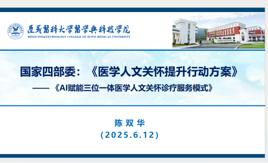 为了深入学习贯彻习近平新时代中国特色社会主义思想,全面贯彻党的二十大和二十届二中、三中全会精神,积极响应国家卫生健康委、教育部、国家中医药局、国家疾控局联合发布的《医学人文关怀提升行动方案(2024—2027年)》,根据医学生的医学人文关怀教育应当贯穿培养全过程,医务人员的医学人文关怀应当贯穿职业全周期,医教机构的医学人文关怀建设行动应当全面落实的要求,2025年6月12日,临床学院组织开展了《AI赋能三位一体医学人文关怀诊疗服务模式》专题培训。临床学院院长陈双华主讲,临床学院全体教职工参加。