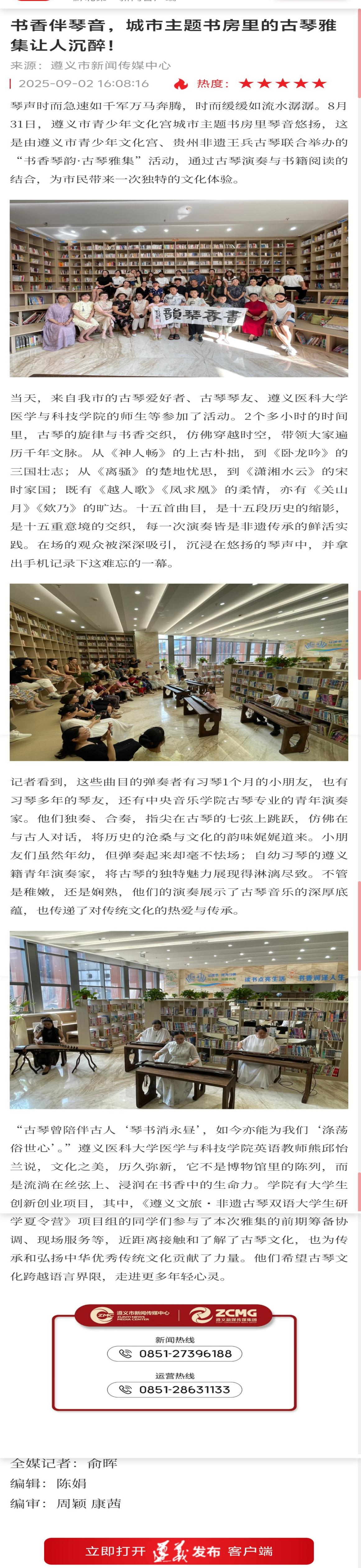 七弦引书香,雅韵动琴心。 2025年8月31日,由遵义市青少年文化宫与贵州非遗王兵古琴联合举办的“书香琴韵·古琴雅集”活动,在遵义市青少年文化宫城市主题书房倾情上演。beat365熊邱怡兰老师带领《遵义文旅・非遗古琴双语大学生研学夏令营》创新创业项目组成员,全程参与了活动策划、筹备协调及现场服务工作,与现场来宾共同见证了这场传统文化盛宴。遵义市新闻传媒中心全媒记者俞晖进行了现场报道,相关内容已在遵义发布APP上刊发。