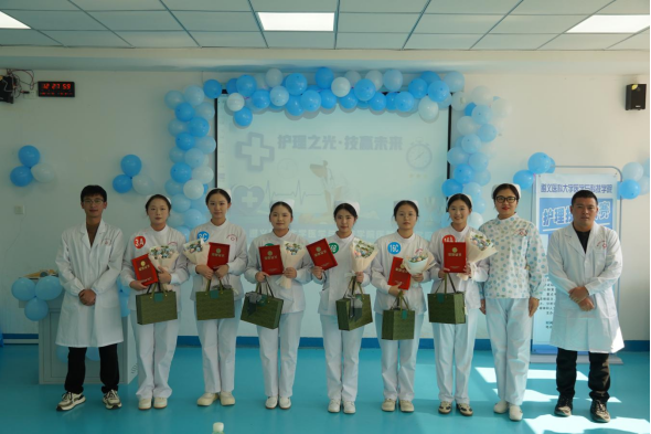 大赛由医养健康学院统筹筹办,从比赛方案、实施细则制定到现场组织执行,学院全体教师、学生会成员及赛事志愿者全程积极参与,充分展现了师生凝心聚力、追求卓越的良好精神风貌。 比赛首先进入检录环节,工作人员完成选手签到与比赛顺序抽签后,详细讲解赛事规则及注意事项,确保全体选手明晰考评要求;随后开展理论考试与技能实操考评,评委分别依据护理专业知识的完整性、系统性,以及操作熟练度、流程完整性、动作连贯性等核心指标,对选手表现进行公正严谨评分;考评结束后,工作人员及时核实各阶段分数,准确登记总分并完成排名;最后进入颁奖环节,医养健康学院副院长杨莹及各部门负责人为获奖选手颁发荣誉证书与奖状,与获奖选手合影留念,全体参赛选手与指导教师共同拍摄集体照,大赛圆满落幕。