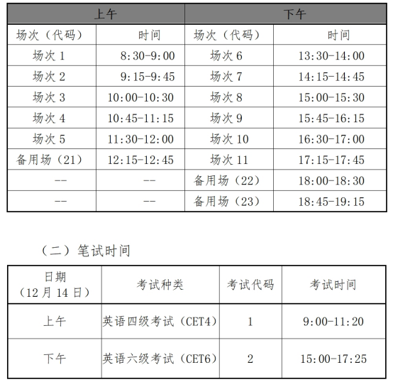 笔试考试时间:12月14日,开考科目为英语四级和六级。