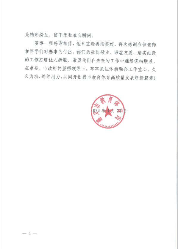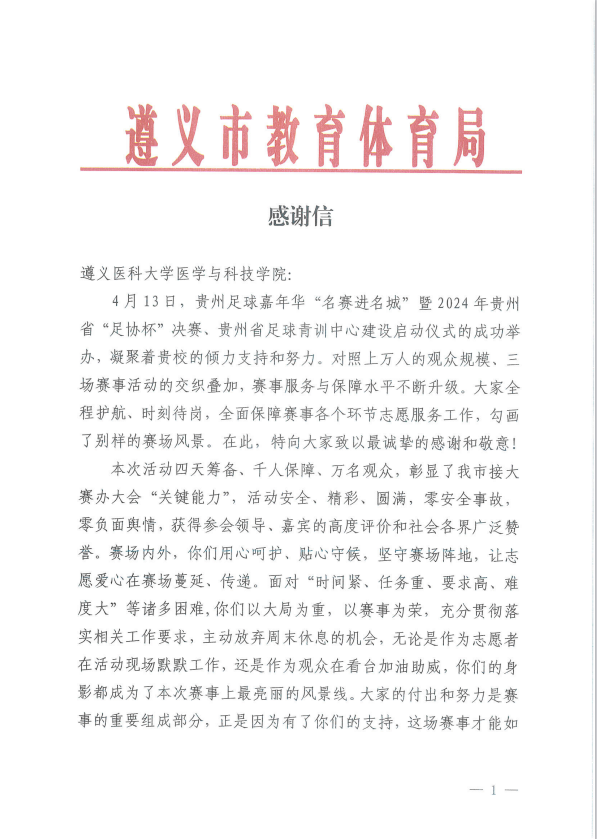 近日,学院收到来自遵义市教育体育局的感谢信,信中对学院团员青年积极踊跃投身志愿服务,敬岗敬业、谦虚友爱、踏实细致的工作态度提出了高度肯定和赞扬,对学院青年志愿者们致以崇高敬意和衷心的感谢。信中指出,面对“时间紧、任务重、要求高、难度大”等诸多困难,志愿者们以大局为重,以赛事为荣,充分贯彻落实相关工作要求,用心呵护、贴心守候,坚守赛场阵地,让志愿爱心在赛场蔓延、传递,志愿者穿梭的身影成为赛事上最亮丽的风景线之一。