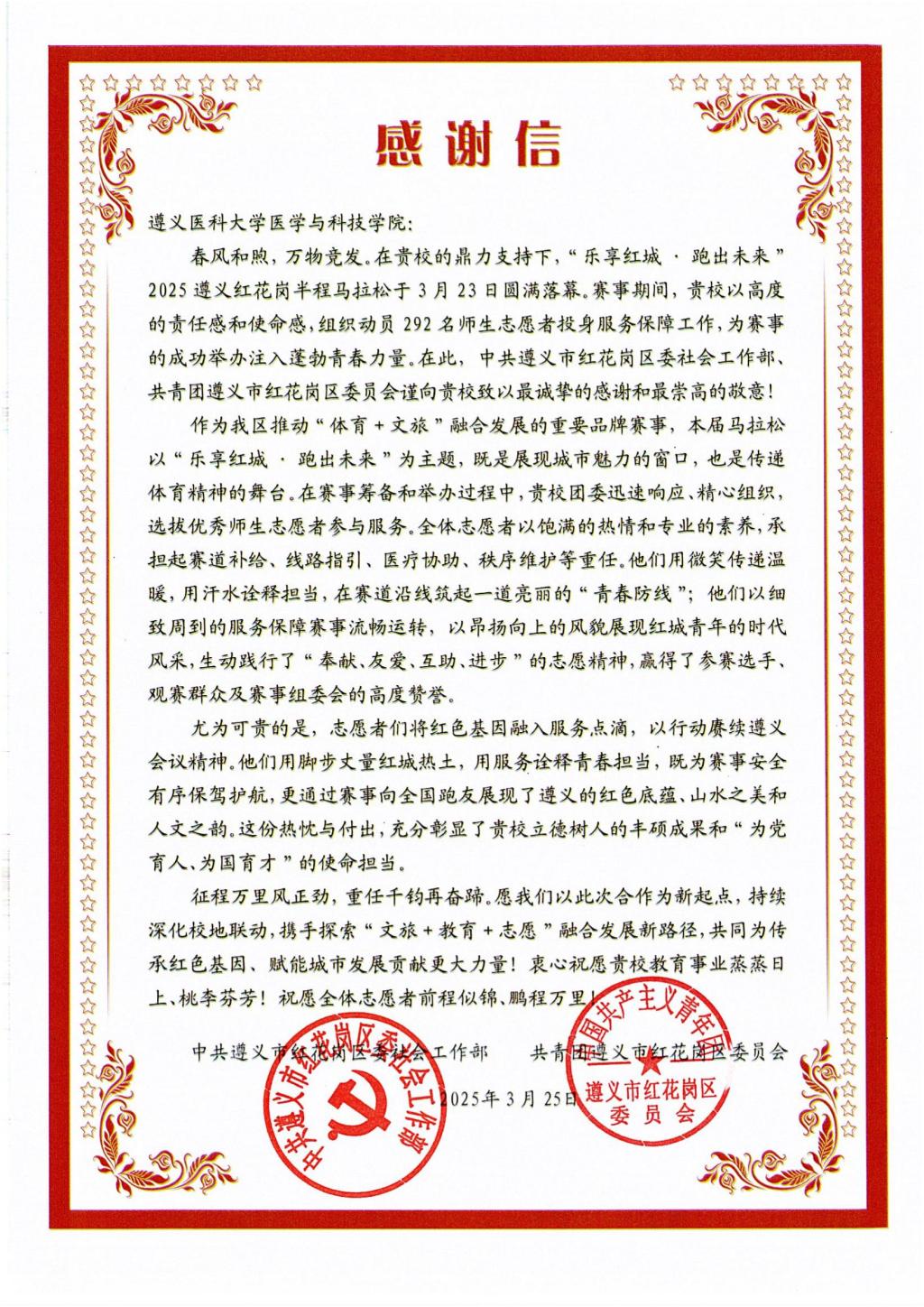 2025年3月23日,“乐享红城·跑出未来”——2025遵义红花岗半程马拉松圆满落幕。赛事期间,我院290余名师生志愿者,积极响应,踊跃报名,全身心投入到赛事的服务保障工作中,为赛事的顺利举办注入了青春活力。