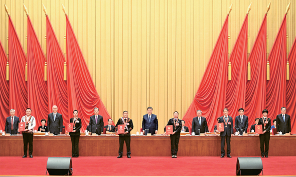 2024年9月27日,全国民族团结进步表彰大会在北京举行。这是习近平等为受表彰的模范个人和模范集体代表颁奖。新华社记者 李学仁/摄