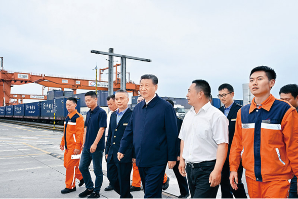2024年4月22日至24日,中共中央总书记、国家主席、中央军委主席习近平在重庆考察。这是22日下午,习近平在重庆国际物流枢纽园区重庆铁路集装箱中心站,同货车司机、列车司机、装卸工人、场站管理人员等亲切交流。 新华社记者 岳月伟/摄