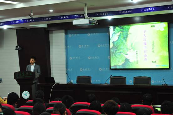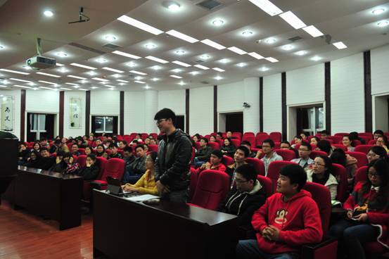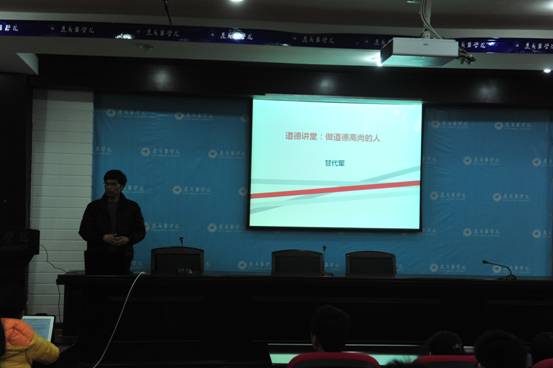 在讲座的开始,甘老师介绍,本期道德讲堂的主讲人有些特殊,他没有崇高的地位,没有金闪闪的学历,他和在座的同学一样,只是一名普通的学生,但他用自己的行动诠释了“予人玫瑰,手有余香”的内涵。