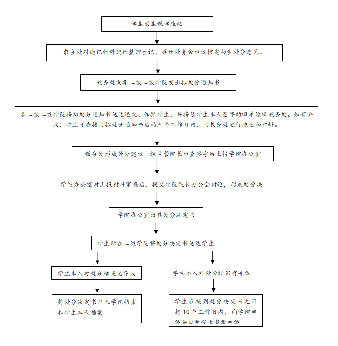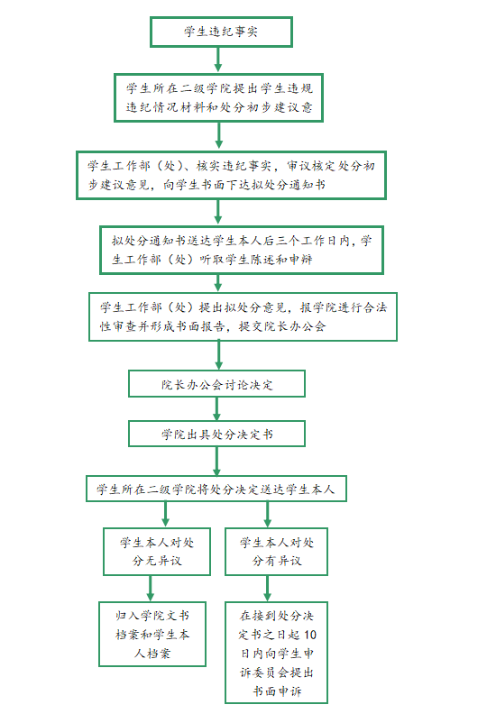 学生工作部(处)、教务处将拟处分意见和处分相关材料报学院进行合法性审查并形成合法性审查结论书面报告,和其他有关材料一起提交院长办公会,经院长办公会研究批准后,学院出具处分决定书,并由各二级学院亲自送达受处分学生。