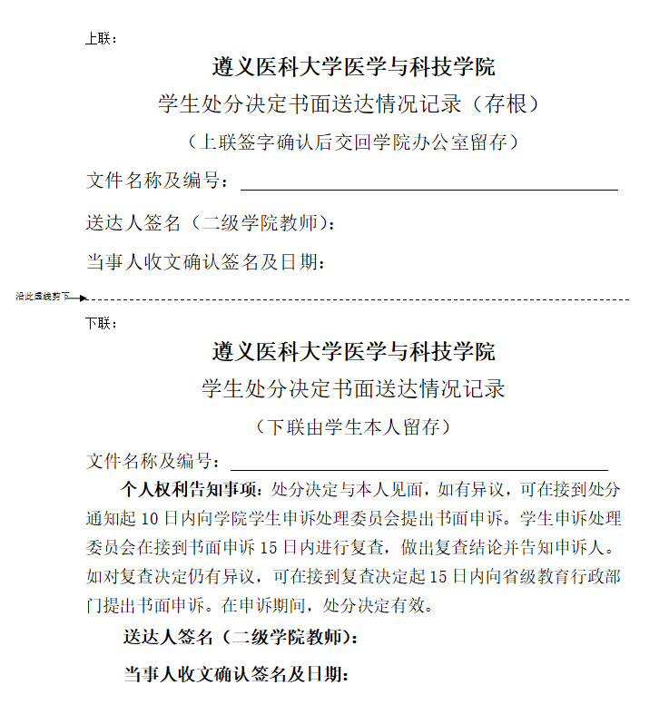 第二十七条 处理、处分决定以及处分送达通知书等,应当直接送达学生本人,由学生本人亲笔签收,负责送达工作人员作为见证人,应在收回告知书的同时签字并标注单位及职务;学生拒绝签收的,可以以留置方式送达,需至少2名工作人员同行,并详细书面记载送达过程及有关情形,同留存的学生处分决定书一起合装存档;已离校的,可以采取挂号或快递等邮寄方式送达,并将邮寄过程书面记载材料、见证人签字及邮寄凭证和留存的学生处分决定书一起合装存档;难于联系的,可以利用学院网站、新闻媒体等以公告方式送达。